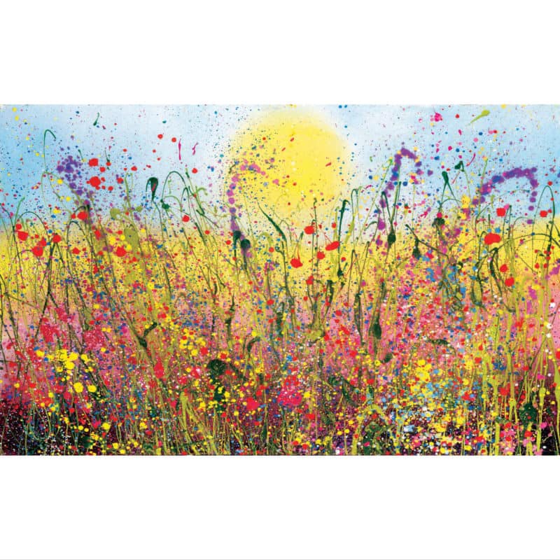 A mixture of the highest quality oil paints, inks, glosses, glazes, fine glitters and gold leaf are applied in a multitude of layers. This alchemy of techniques result in a kaleidoscopic jewel like composition of rich pigments that prismatically reveal the radiance of nature. Initially washes are built like up in tender veils of colour. Later, much bolder marks are used with an energetic dance around the canvas.
